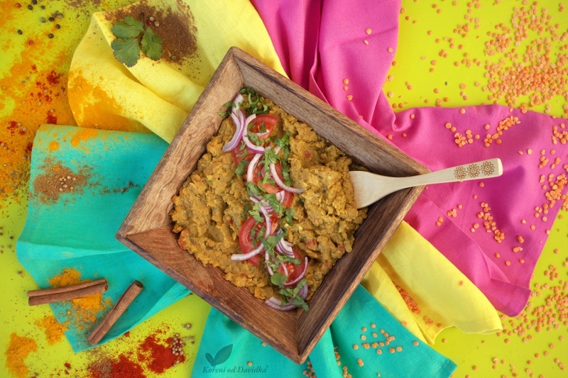 4Pridajte šošovicu a premiešajte. Zalejte pol litrom vriacej vody a kokosovým mliekom. Varte 10-15 minút do mäkka. Priebežne dolievajte vodu, aby konzistencia bola kašovitá.