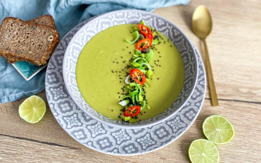 5Polievka zhustne, takže ju ešte zrieďte cca 200 ml vody. Podľa potreby dochuťte. Pri podávaní nakvapkajte šťavu z limetky.