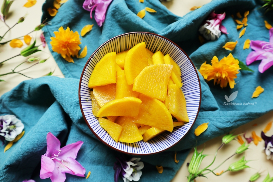 3Z reďkovky zlejte šťavu, ktorú pustila. Pripravené plátky dajte do uzatváratelných fliaš, zalejte hotovým horúcim nálevom a uzavrite fľašu.