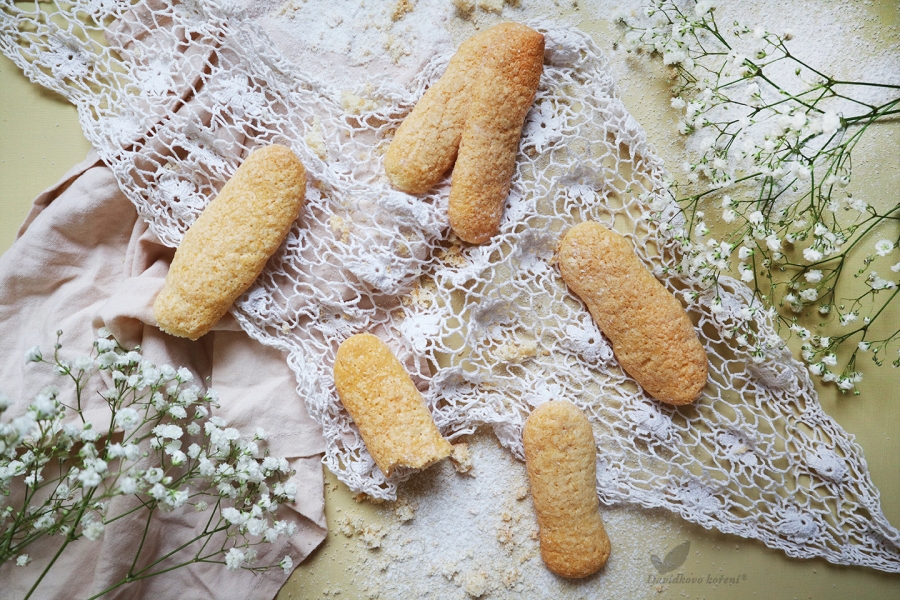 4Naplňte veľký cukrársky sáčok vybavený väčšou guľatou špičkou (alebo sáčok na zips s odrezaným rohom) a na 2 plechy vyložené papierom na pečenie nastriekajte cca 10 cm dlhé piškóty.