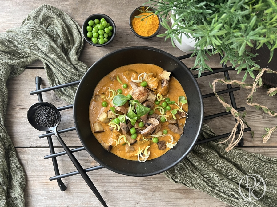 3Základ na omáčku rozmixujte do hladka, vlijte kokosové mléko a opět promixujte. Chuť zvýrazněte citronovou šťávou. Do omáčky přidejte kousky upečeného lilku a žampionů.