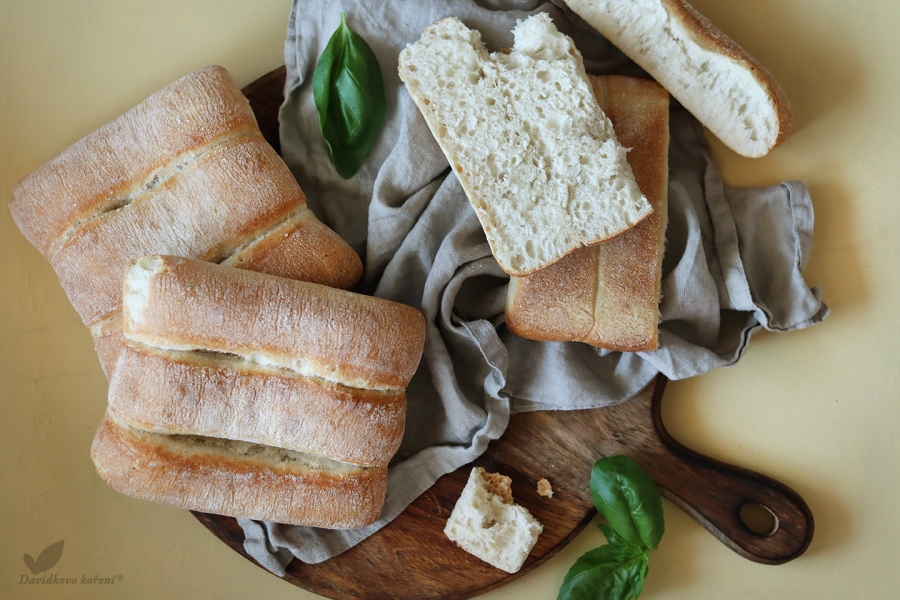 7Pomocou kusu kartónu alebo lopaty zosuňte ciabatty na rozpálenú plochu, do spod trúby vlejte asi 2 dcl vody, a pečte cca 15 - 20 minút, ak hnednú ciabatty príliš rýchlo, stlmte v polovici pečenia teplotu. Cca po 5 minútach vyvetrajte prebytočnú paru.