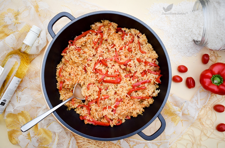 4Rýži propláchněte a dejte ji do pánve. Dobře zamíchejte a přilijte víno a zbytek vody. Na mírném ohni duste, dokud rýže nezměkne (pánev nechte zakrytou pokličkou). V průběhu pánví "zatřepejte", aby se suroviny nespálily, ale nemíchejte.
