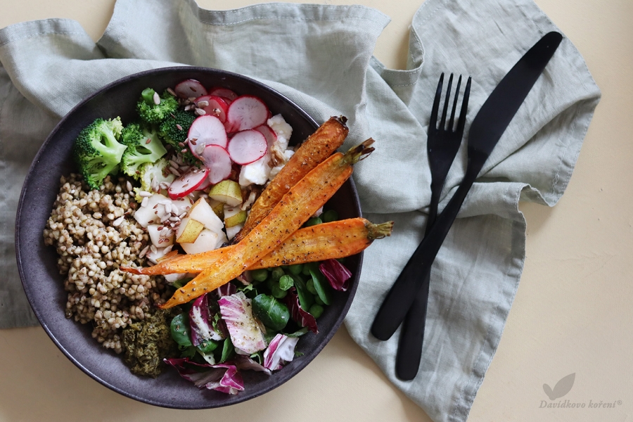 5Do misky naaranžujte salát, který pokapejte olivovým olejem, osolte a opepřete. Přidejte pohanku s pestem, hrušku, ředkvičky, které zakápněte citronovou šťávou, brokolici a hrášek. Kozí sýr nakrájejte na kostičky a na talíři zakápněte medem a posypejte ořechy. Nakonec přidejte upečenou mrkev.
