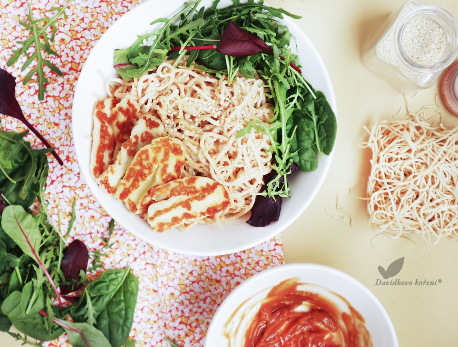 4Omáčku zmiešajte s ešte teplými rezancami. Každú porciu posypte sezamom, pridajte syr halloumi a čerstvú rukolu.