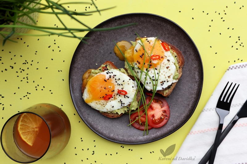 3Dobrý ražný alebo toastový chlieb opečte a natrite naňho guacamole. Na povrch poukladajte volské oká a posypte troškou čerstvo nasekaných byliniek.