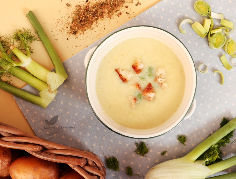 1Zemiaky a fenikel nakrájajte na malé kocky. Vrchnú časť fenikla si nechajte na ozdobenie. Cibuľu nakrájajte nadrobno a pór na kolieska.
