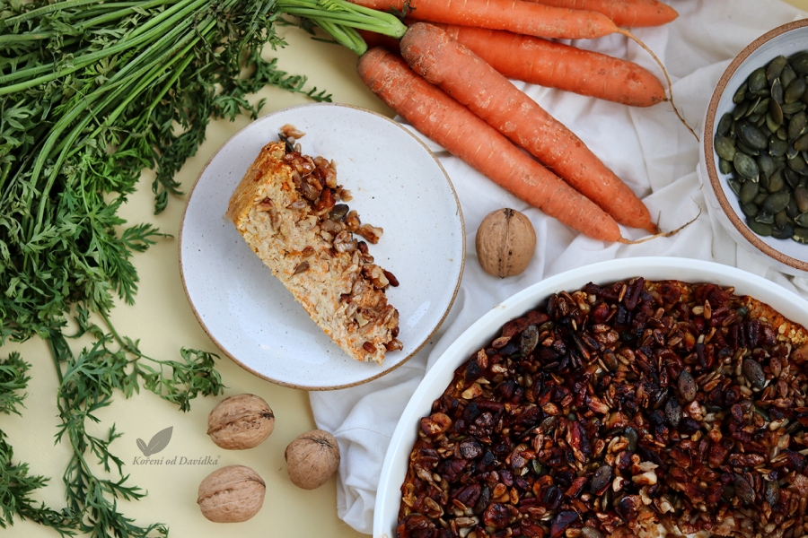 3Do veľkej misy rozbite vajcia, pridajte mlieko, prášok do pečiva, korenie, soľ a premiešajte. Pridajte mrkvu, ovesné vločky, hrozienka a znovu premiešajte. Vylejte do formy a odložte bokom.