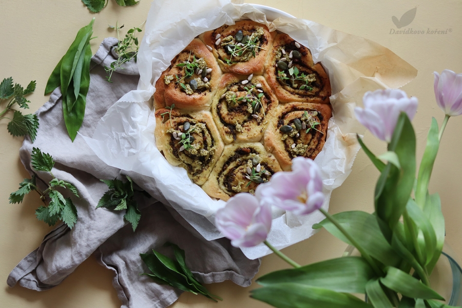 4Vykysnuté cesto rozvaľkajte na plát vo veľkosti cca 50 x 30 cm a potrite pestom (využite všetko pesto). Zarolujte do rolády dlhšou stravou (roláda bude mať vo finále dĺžku cca 50 cm). Nakrájajte na kúsky vo veľkosti cca 4 cm a vyskladajte ich do formy. Nechajte medzi nimi rozostupy, ešte nakysnú.