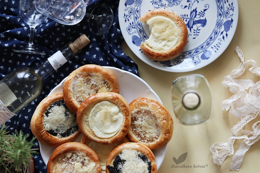4Takto pripravené koláče nechajte ešte asi 30 minút kysnúť. Potom im okraje potrite rozšľahaným vajcom a na vymastenom plechu ich pečte na 180°C dozlata.