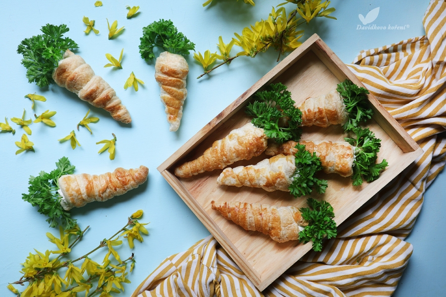 4Vychladnuté kornúty naplňte nátierkou. Najlepšie sa naplňujú pomocou zdobičky na krém. Navrch naplneného kornútu zapichnite listy petržlenu ako vňať.