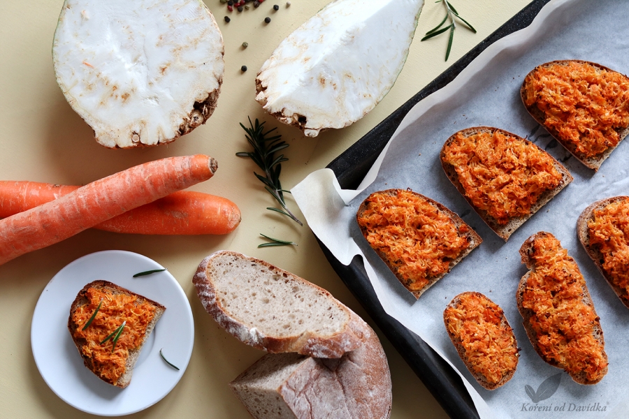 4Chlieb nakrájajte na polkrajce a uložte na plech vyložený papierom na pečenie. Na každý krajec potom naneste kopček zmesi a trošku utlačte.