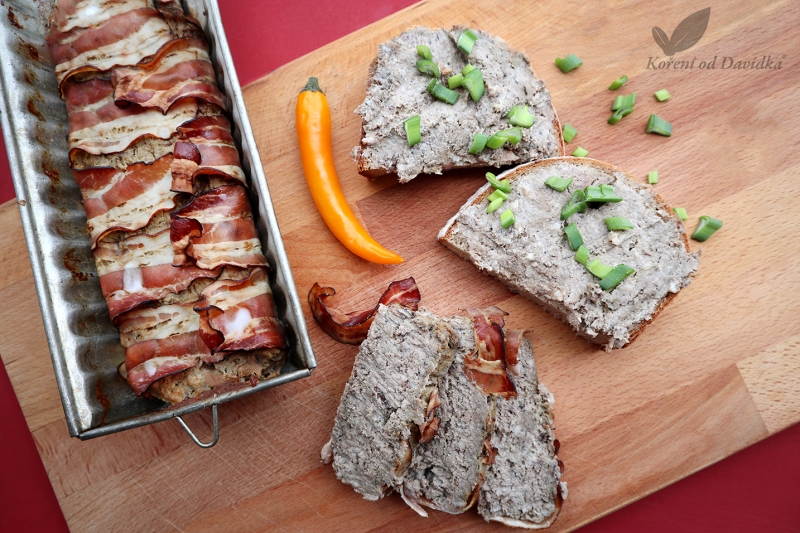 8Formu vyložte plátkami slaniny tak, aby konce vyčnievali z formy a mohli ste nimi nakoniec prikryť paštéku. Formu následne naplňte zmesou pomletého mäsa a slaninou ju prikryjte.