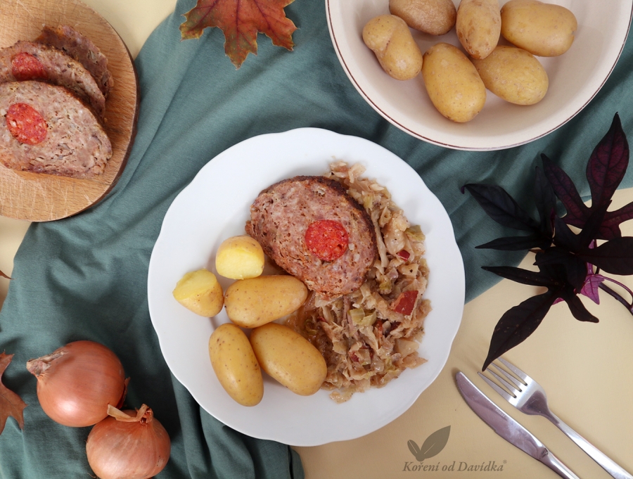 Plnená sekaná s hlávkovou kapustou a varenými zemiakmi