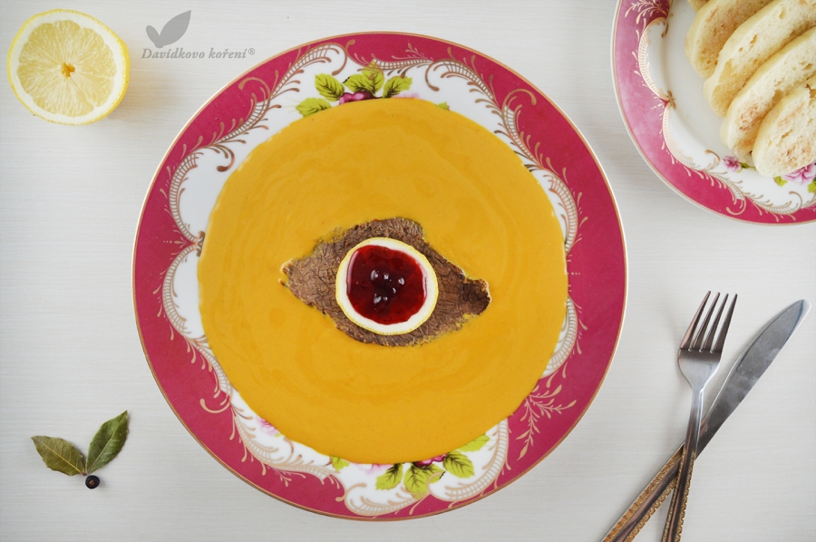 8Mäso nakrájajte na tenké plátky a podávajte s omáčkou, plátkom citrónu so smotanou, brusnicovou marmeládou a žemľovou knedľou.