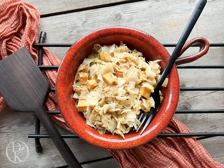 Fleky s pečeným zelím a orestovanými kousky tofu