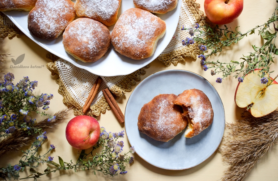 4Z vykynutého těsta si pomocí lžíce vždy kus "vydloubněte", prsty jej trošku roztáhněte do stran, posypejte skořicí, lžičkou cukru, na to přidejte nastrouhaná jablka a zabalte. Tímto způsobem vytvořte všechny buchty.