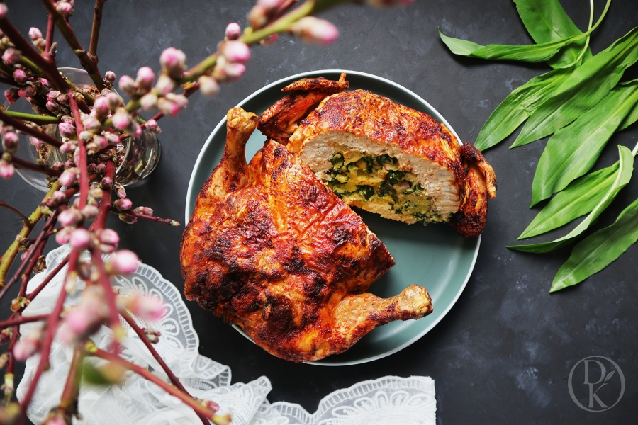 1Kura opláchnite a vykostite. Odstráňte len chrbát a hruď, krídelká a stehienka nie. Kurča zvnútra aj zvonka nasoľte a okoreňte korením Davídkovo pečené kura.