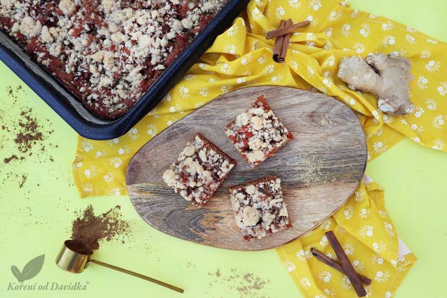 5Z hladkej múky, cukru, masla, zázvoru a škorice si vyrobte mrveničku, ktorou posypte pripravený koláč.