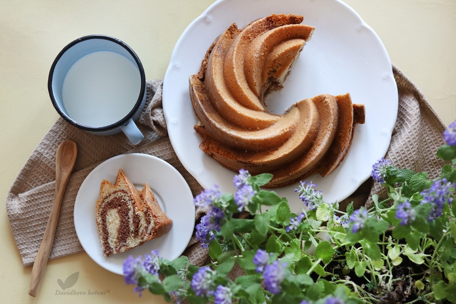 4.Hotové cesto nalejte do vymazanej a vysypanej formy na bábovku. Začnite s časťou svetlého cesta, potom nalejte trochu kakaového, opäť svetlého, zvyšok kakaového, a nakoniec zalejte rovnomerne bábovku opäť cestom svetlým. Pečte na 160°C asi 60 - 90 minút, podľa toho, ako pečie vaša rúra. Že je bábovka upečená poznáte tak, že do nej zapichnete drevenú špajľu. Pokiaľ vyjde suchá a čistá, je bábovka hotová. Pokiaľ sa na nej zachytí cesto, ešte dopekajte.