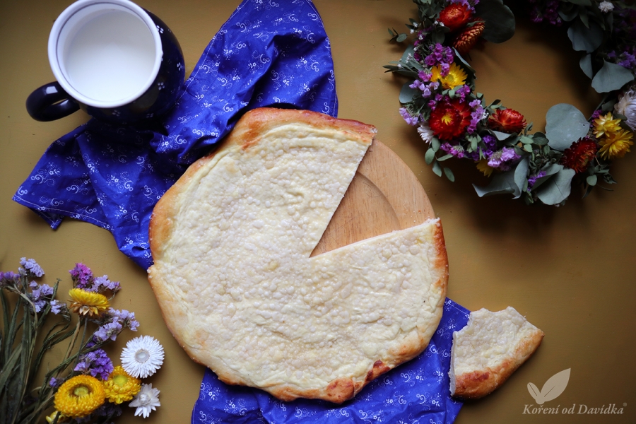 3.Mlieko ohrejte na telesnú teplotu (37°C), a z celkového množstva odlejte 40 ml do väčšej šálky. Pridajte lyžičku cukru, lyžičku múky a rozdrobené droždie. Na teplom mieste nechajte vystúpiť kvások.