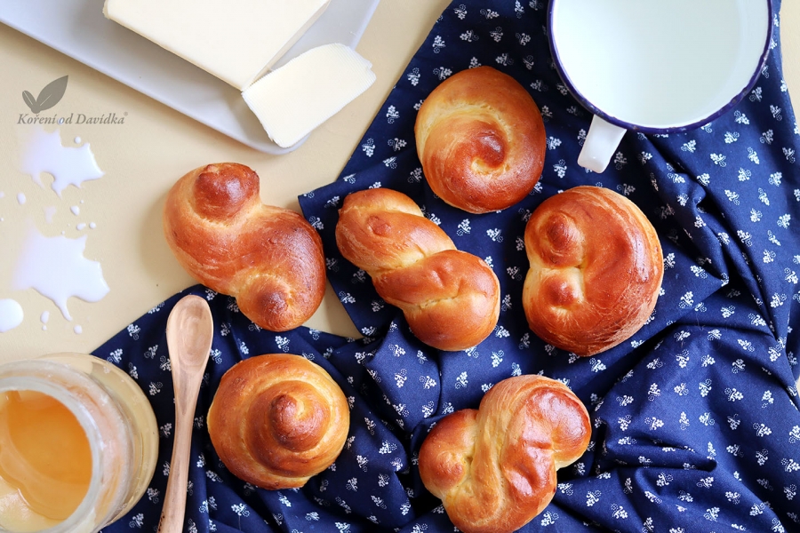 5Zamotané uzlíky potrite vajcom rozšľahaným s 2 lyžicami vody a nechajte ešte 20 minút trochu kysnúť. Rúru zatiaľ rozohrejte na teplotu190 stupňov.