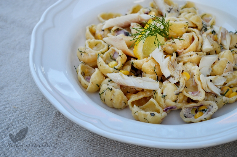 Davídkove cestoviny s červenou cibuľou, kôprom, kukuricou a údenou rybou
