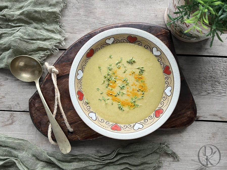 3Vařte do změknutí asi 15 minut. Přidejte trošku kurkumy pro zářivější barvu a smetanu. Rozmixujte do krémové konzistence tyčovým mixérem nebo ve stolním mixéru.