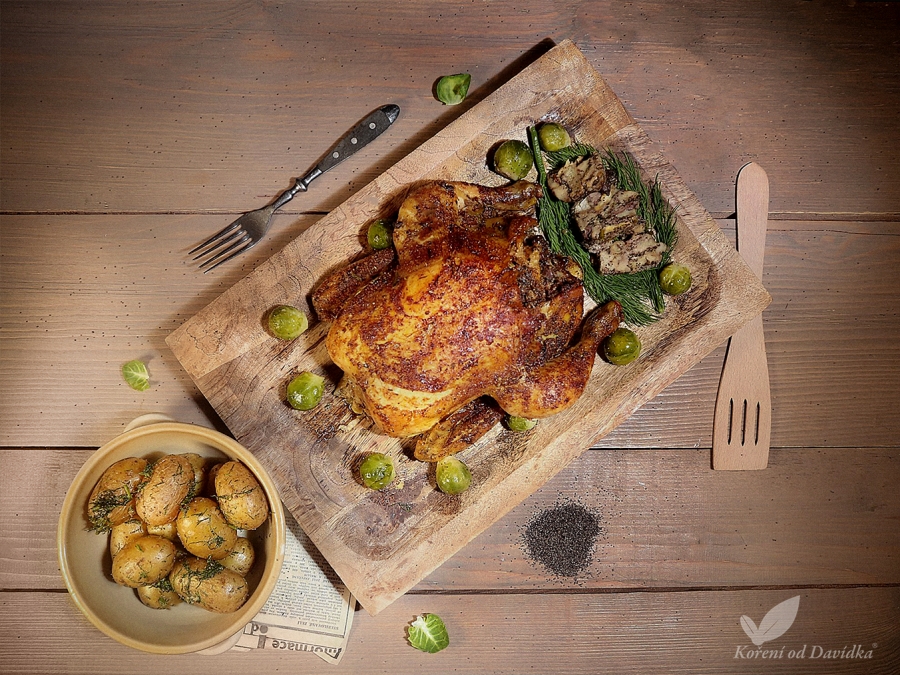 1Kurča opláchnite, vysušte, posypte soľou a korením FARMÁRSKA ZMES BREZINA.