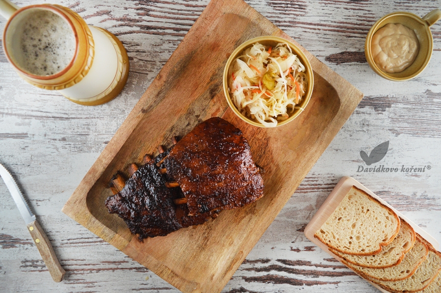4Rebrá podlejte desaťstupňovým pivom, priklopte prikrývkou alebo alobalom a pečte do mäkka. Bude to trvať minimálne 6 - 8 hodín.