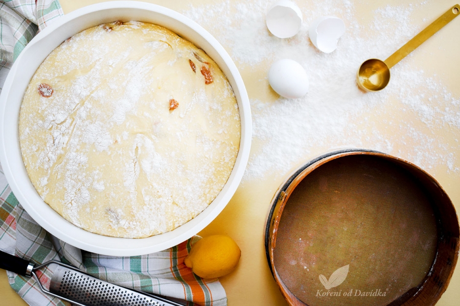 4Jakmile je těsto vymíchané, lehce do něj zapracujte vanilku, kůru z 1 citronu a oprané rozinky. Lehce poprašte moukou.