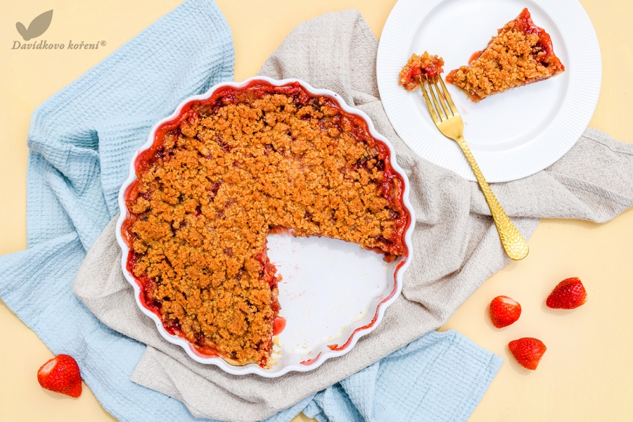 1Na cesto rovnomerne rozprestrite ovocnú zmes (ovocie pustí veľa šťavy, tak prípadne trochu sceďte a nedávajte všetku šťavu do koláča). Posypte mrveničkou.