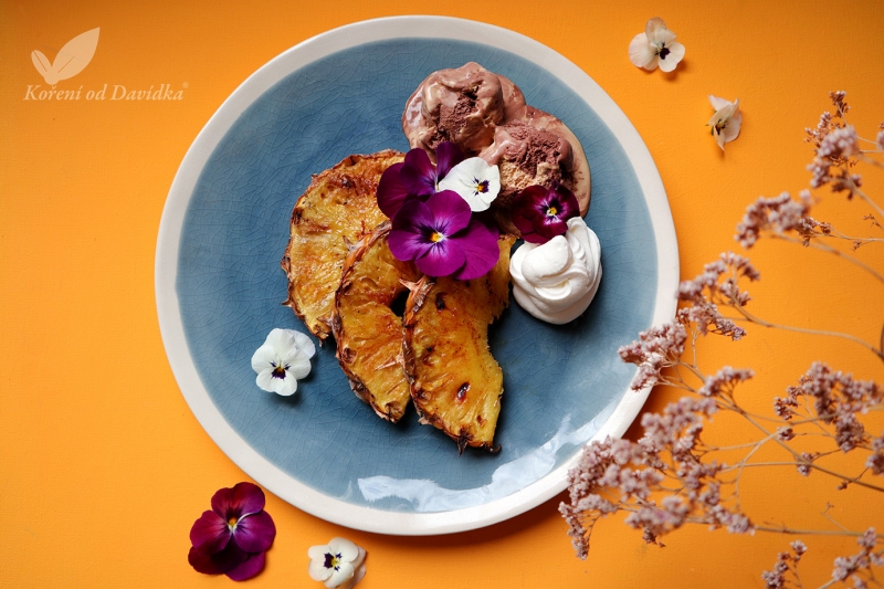 5Ugrilovaný ananás servírujte s kopčekmi zmrzliny a šľahačkou.