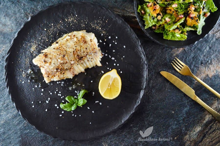 Treska na citrónovom korení so šalátom s čiernym sezamom a grilovaným pomarančom