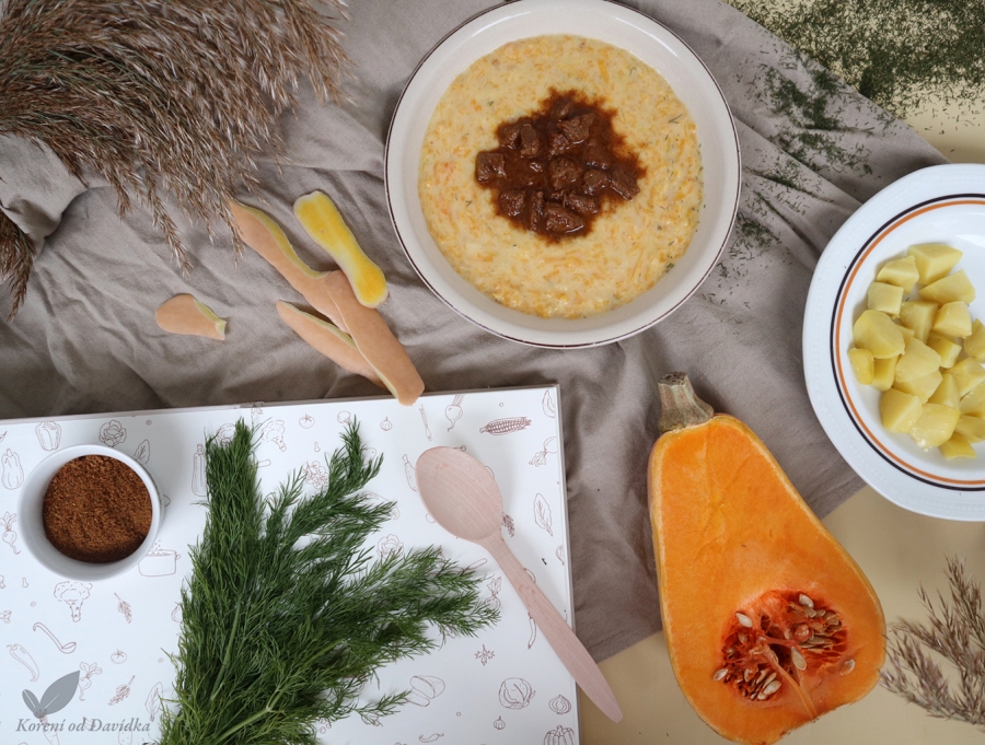 2Pridajte nastrúhanú tekvicu. Osoľte, okoreňte podlejte trochou vody a duste do mäkka cca 30 minút.