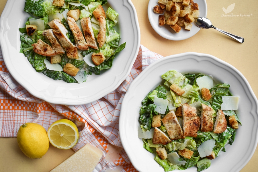 6Nakrájané listy rímského šalátu zalejte pripraveným dresingom, opatrne premiešajte a dajte do hlbších tanierov. Posypte krutónmi, hoblinkami parmezánu a pridajte kuracie prsia nakrájané na plátky.