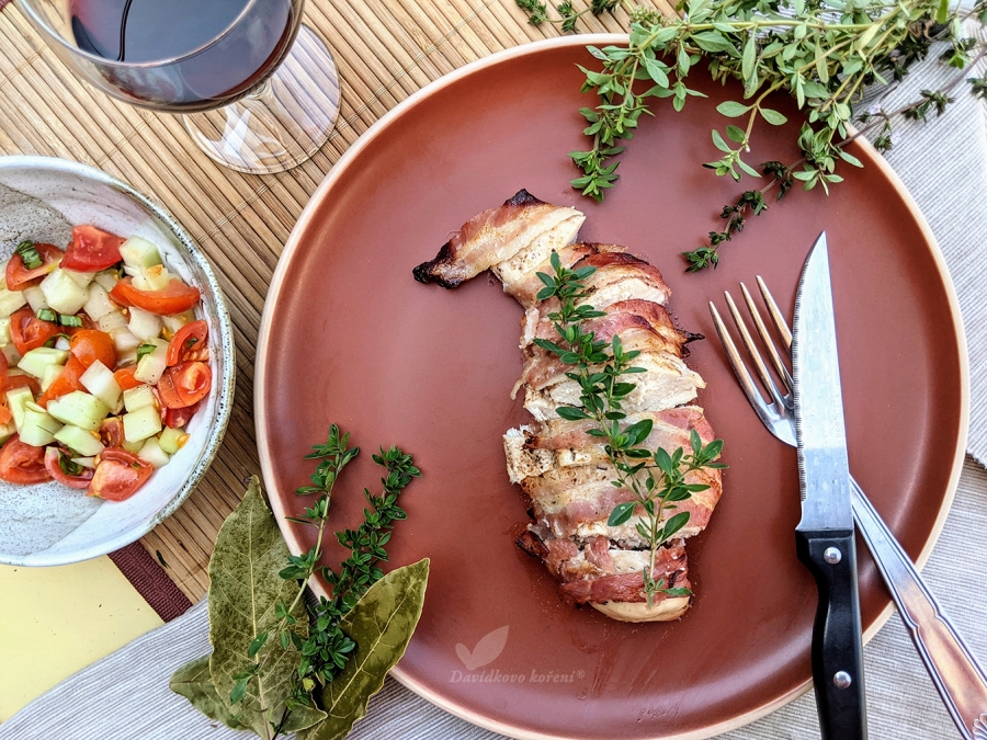 3Obalte každé kuřecí prso tenkými plátky slaniny. Začněte na jednom konci a obalte slaninu směrem k druhému.