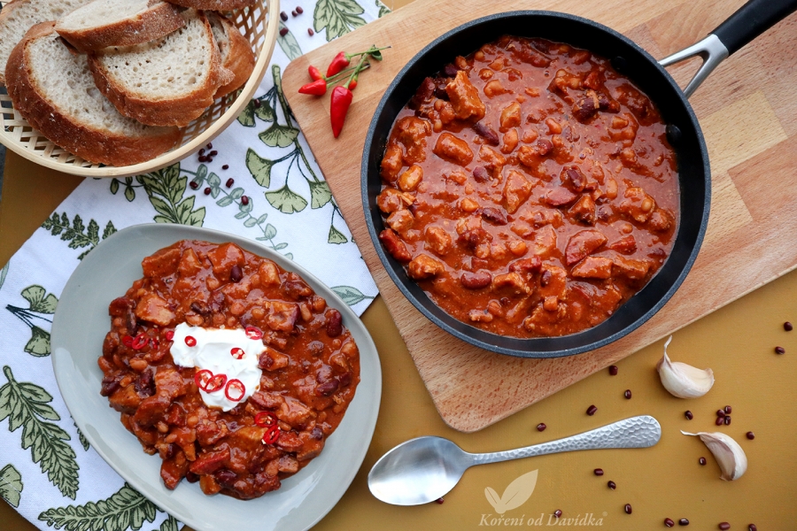 2Slaninu nakrájajte na kocky, cibuľu a papriku na drobno, paradajky na osminky a mäso na menšie kocky. Fazule z plechovky rozmixujte do hladka, budú fungovať ako zahusťovadlo.