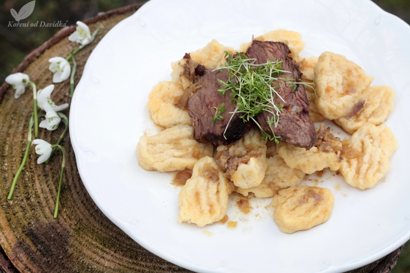 5Do pekáča vložte kúsky slaniny, nakrájanú cibuľku, vložte mäso a podlejte 2 dcl vody.