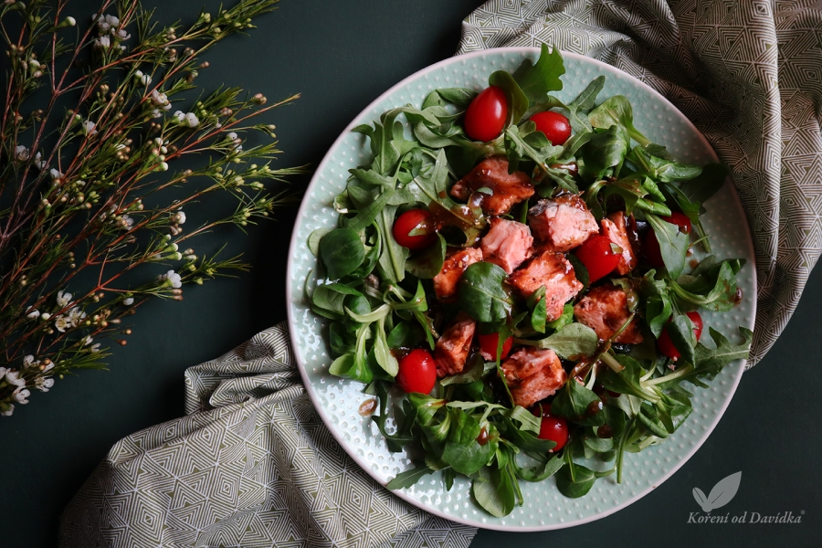 3Paradajky umyjte, rukolu a valeriánku prepláchnite pod tečúcou vodou. Zeleninu naservírujte na tanier spolu s kúskami lososa a prelejte pripraveným dresingom.