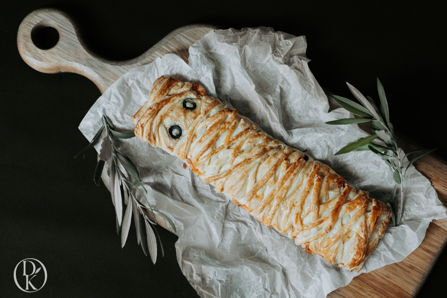4Na jedné straně závinu nechte škvíru na oči, které vytvořte z koleček olivy.